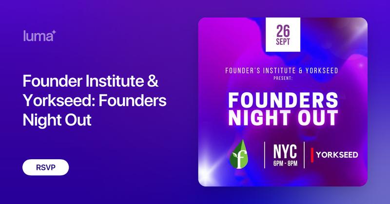 9/26 Thursday - As a local partner of FI, We're excited to partner again with Founder's Institute to host a founder night out. Join the directors of Founder Institute and the founder and investor community of Yorkseed for a chance to mix and mingle with the NYC startup ecosystem.